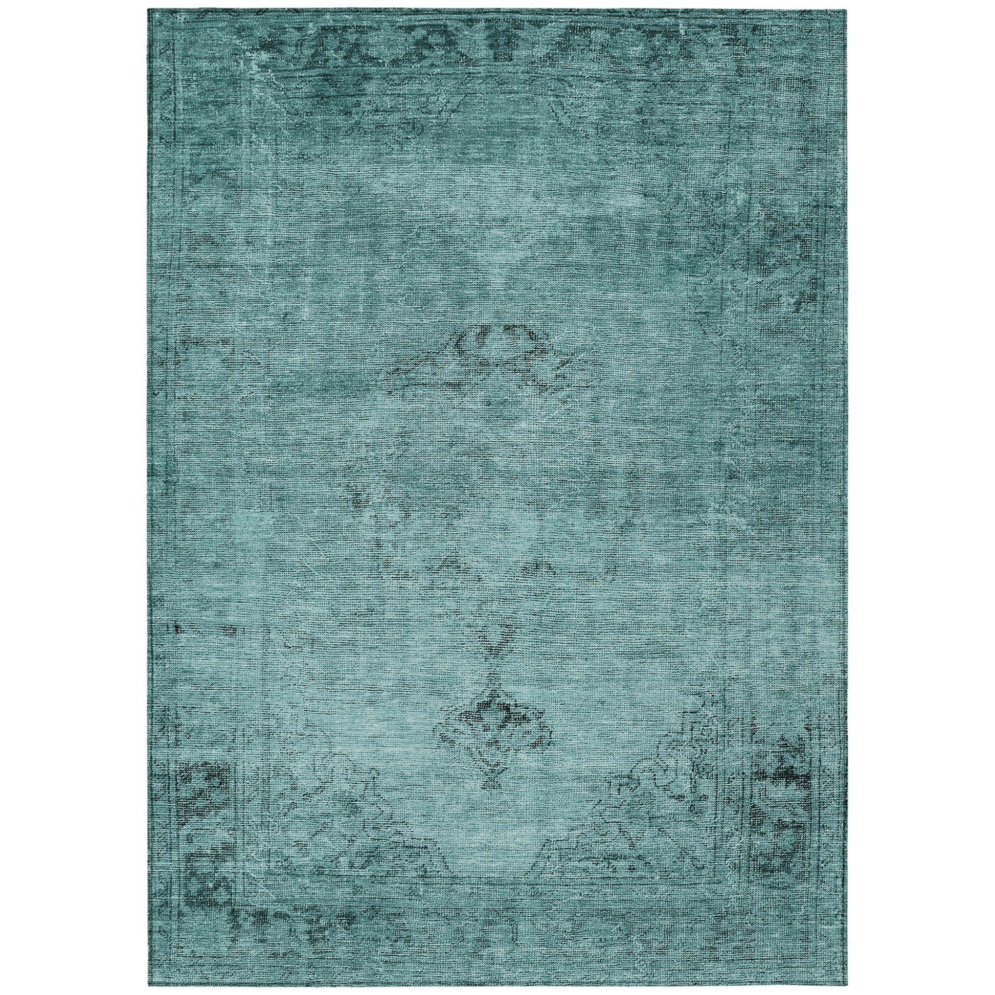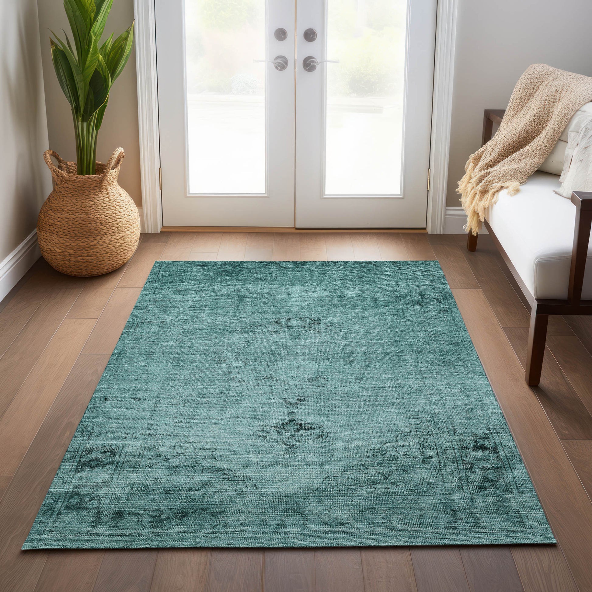 5' X 8' Teal Blue Turquoise And Charcoal Oriental Washable Indoor Outdoor Area Rug